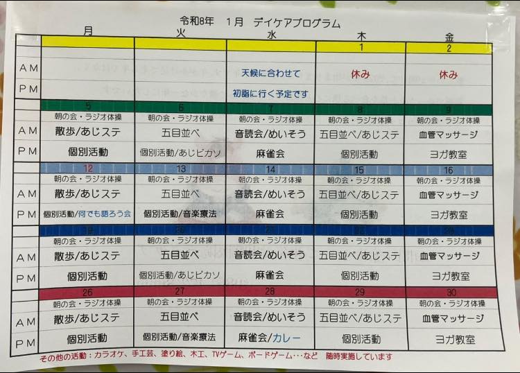 1月のデイケアプログラムの紹介です。ヨガ、手芸、ボードゲーム、運動プログラム、就労支援プログラム「あじステ」などのいつもの活動に加えて、ドライブでは初詣に行く予定です。